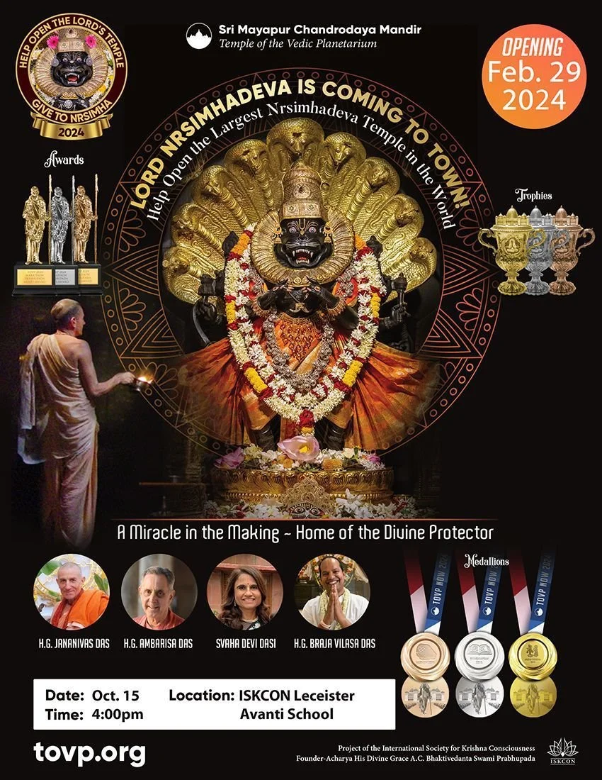 The TOVP Tour is coming to ISKCON Leicester this Sunday with Lord Nrsimhadeva in the form of His Satari (helmet) and Lord Nityananda’s Paduka’s (shoes) to bless devotees and bring news of the Grand Opening of Lord Nrsimhadeva’s completed TOVP Temple from February 29 - March 2, 2024.