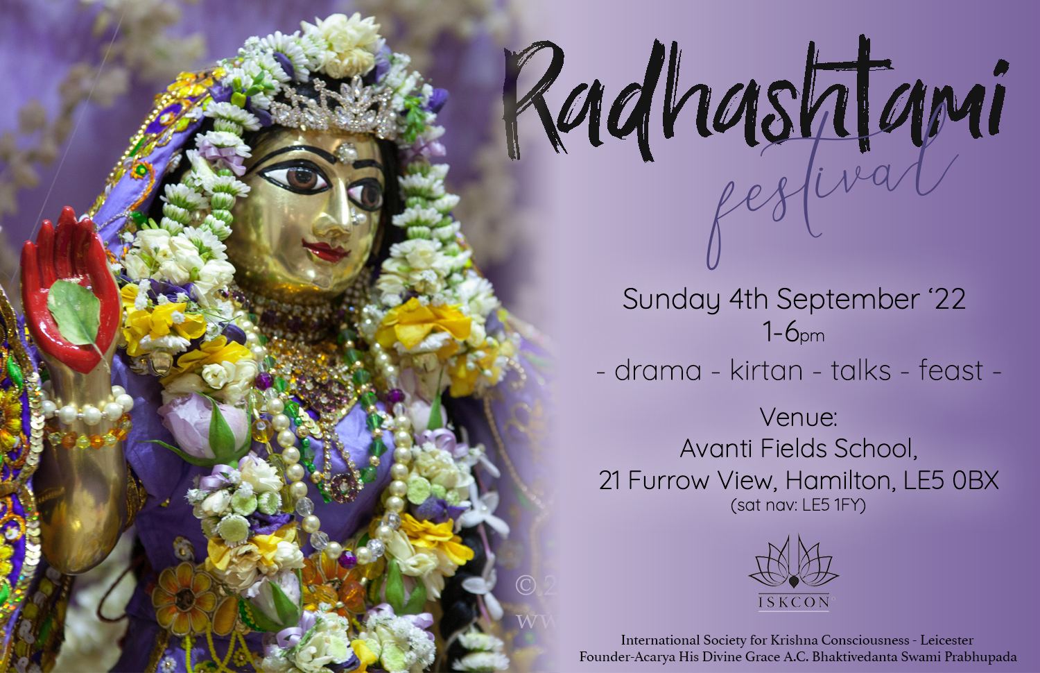 Radhashtami Sponsorship Donations can be sent via BACS ISKCON Leicester, Lloyds TSB Bank, Sort code: 30-99-21 Account number: 01463646 Or you can Visit for more info: Support ISKCON Leicester PayPal: https://www.paypal.me/iskconleicester For more information contact Saci Tanaya Das: 07737280077